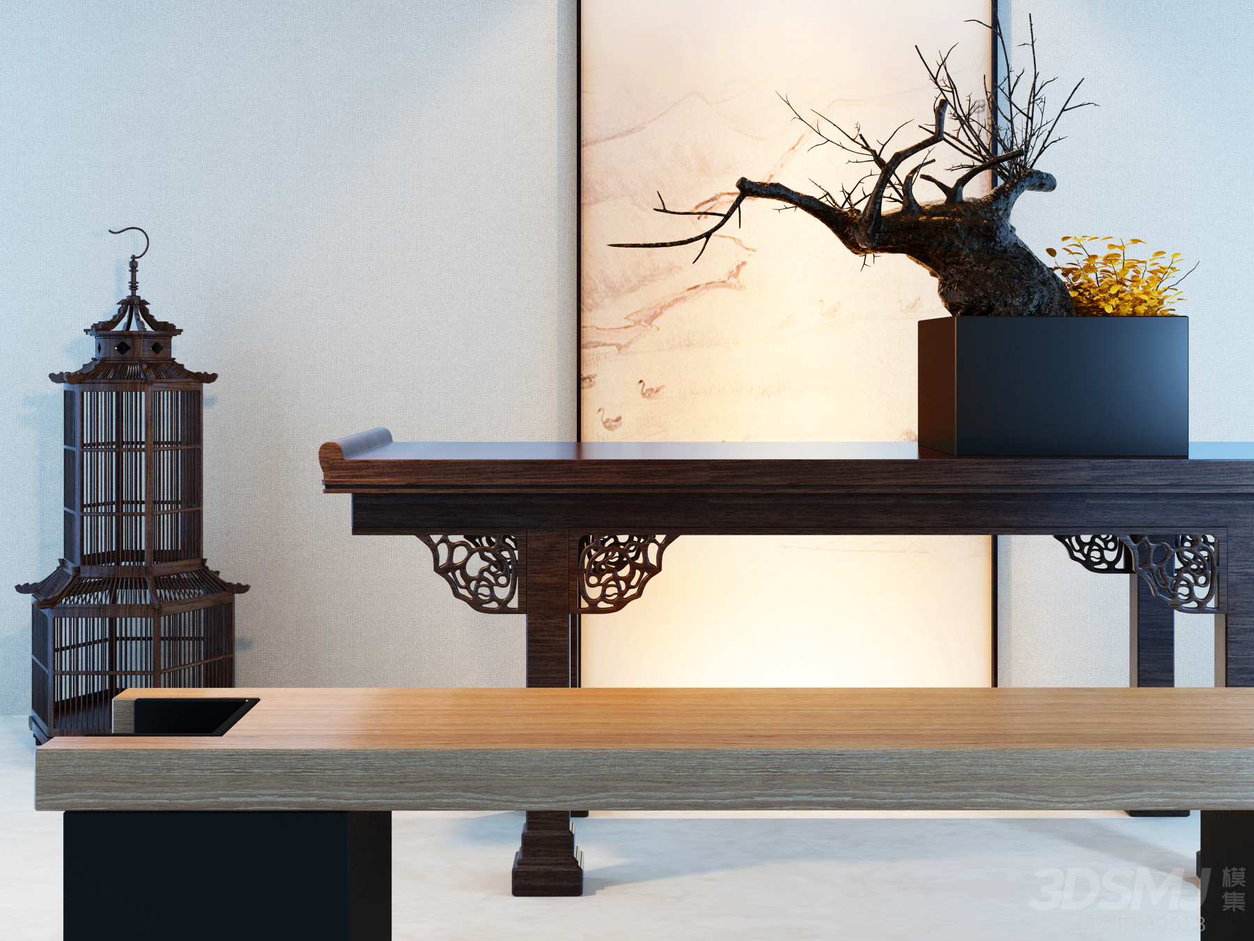 新中式桌子干支鸟笼组合