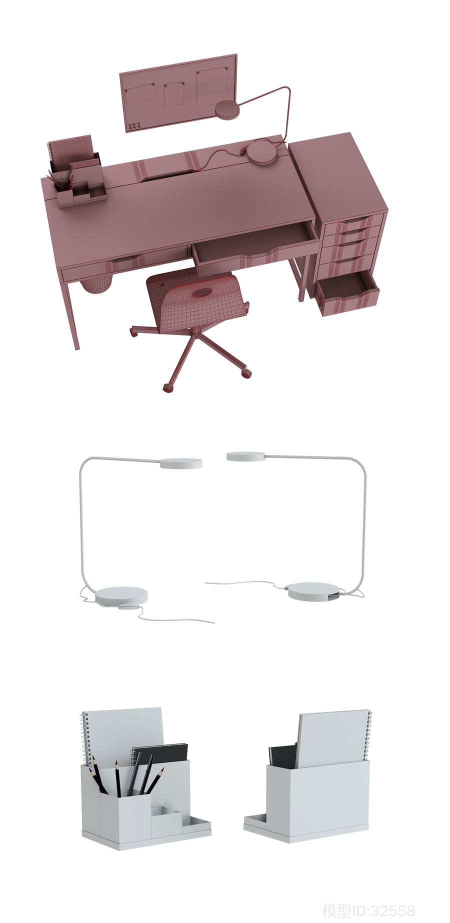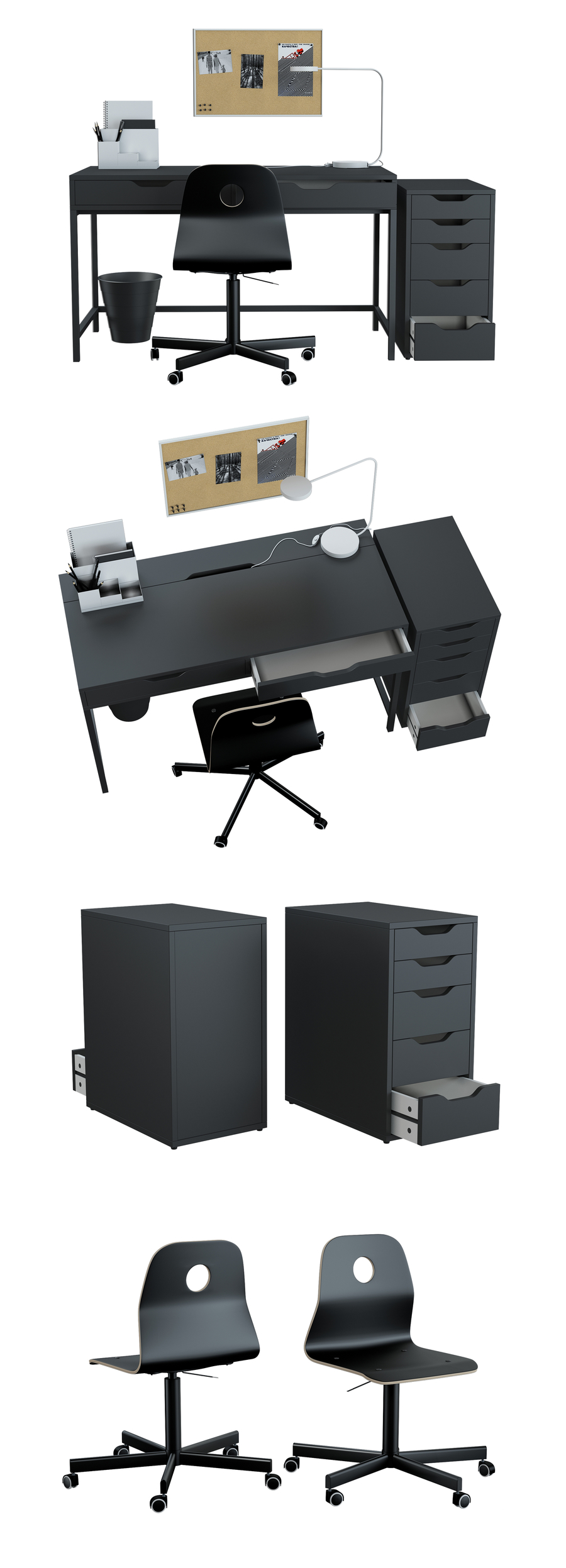 宜家为工作区域提供了一套家具。ALEX办公桌,灰色灰色ALEX带抽屉柜子,灰色VOGSBERG / SPORREN工作椅,黑色UPPERLIG台灯,LED,浅灰色VEGGIS支架,办公用品的白色TIENA支架,白色FNISS箱,颜色为黑色。polys:322,071 Verts:161,860