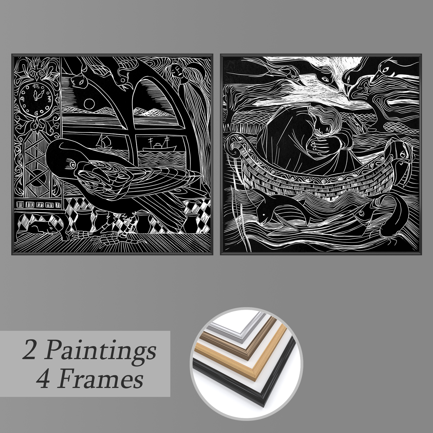 该集合包含2幅绘画和4种框架选项(塑料,木材,青铜,钢)。