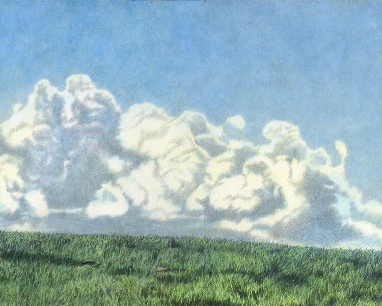 然后他用最少的选定元素创造了一个叙事,如光,云,绿,风,动物等,这是人与土地关系中精神的本质。