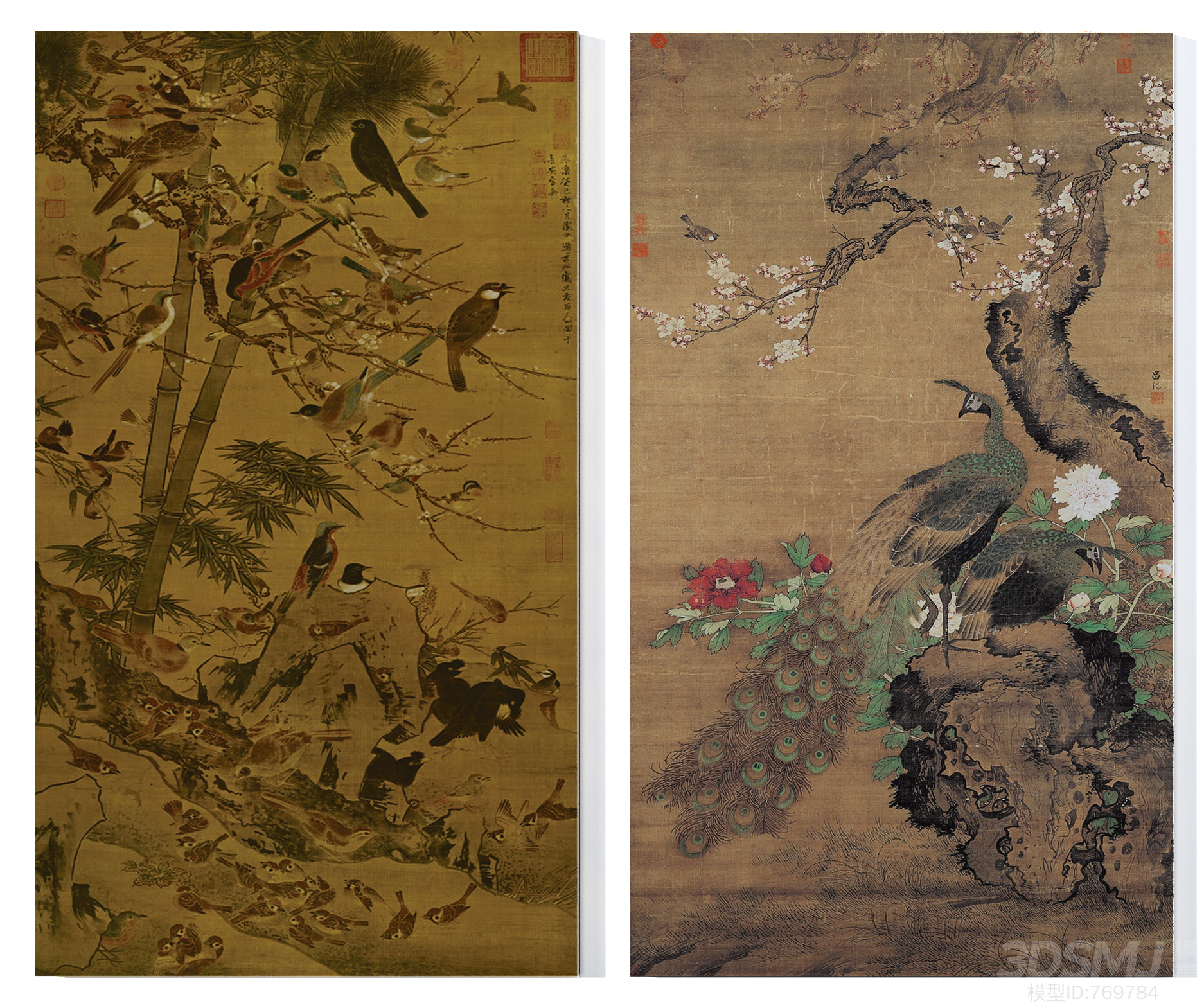 中式传世名画中式传统鸟禽花艺挂画组合3D模型