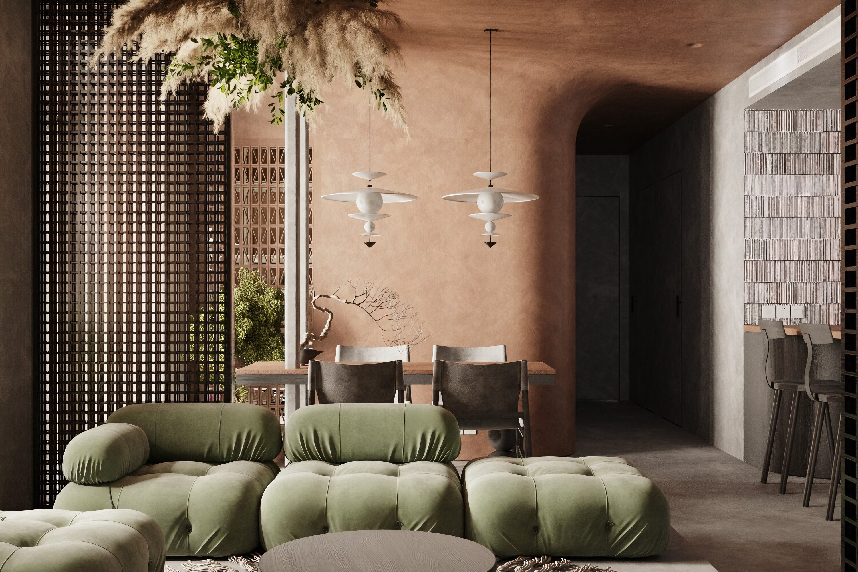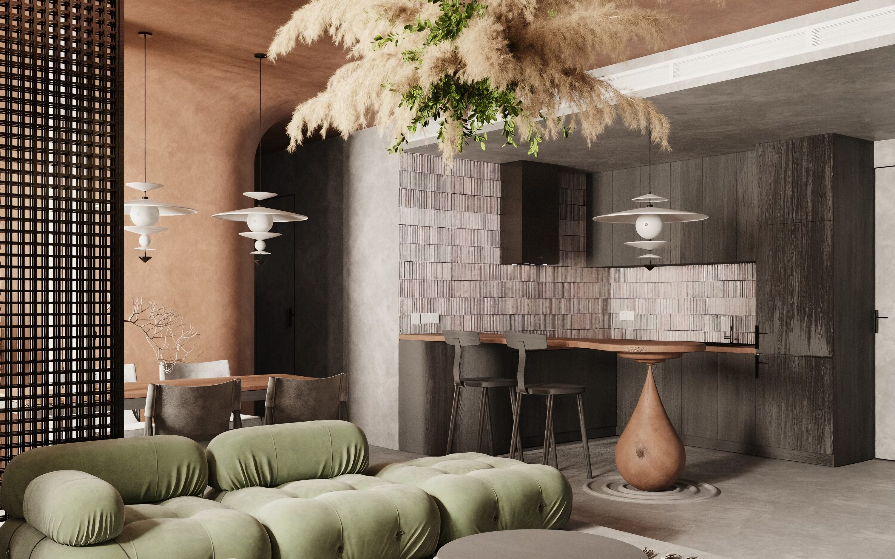 现代自然风客餐厅 侘寂客餐厅 悬挂蒲苇绿植造型吊灯